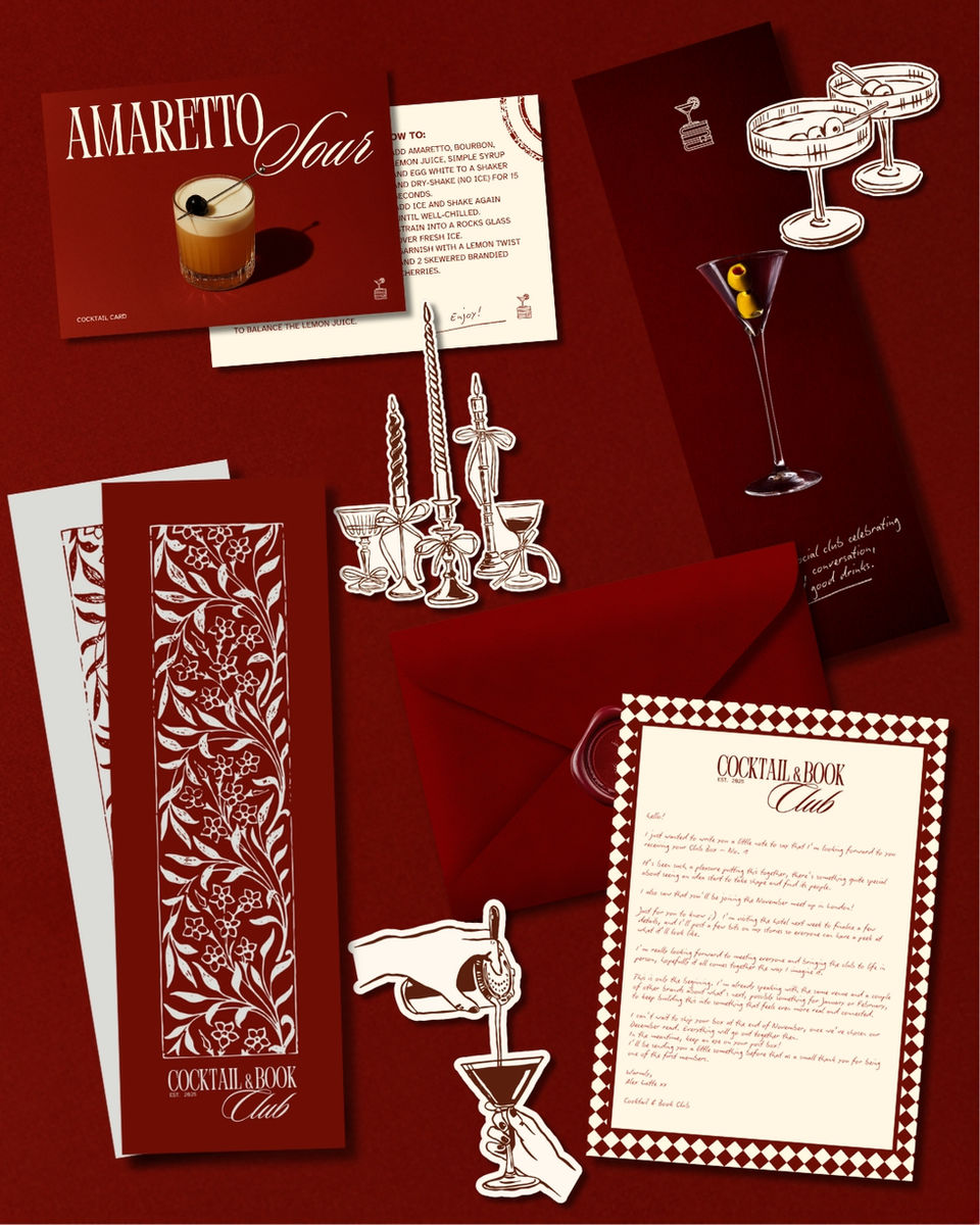 Two Cocktail & Book Club Prints, featuring an exclusive cocktail recipe and an illustrated art card.